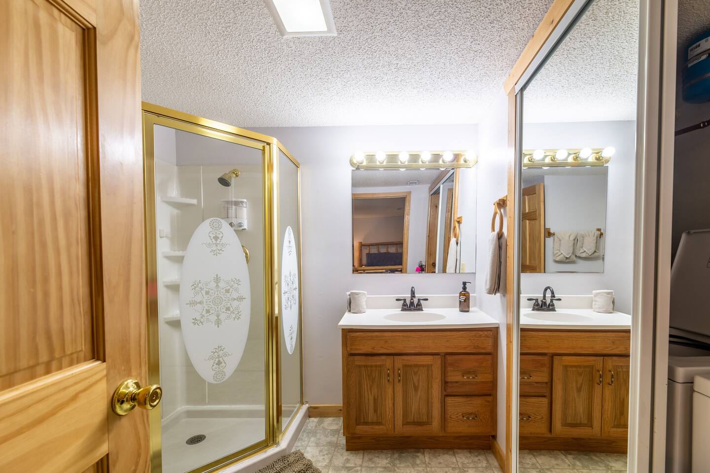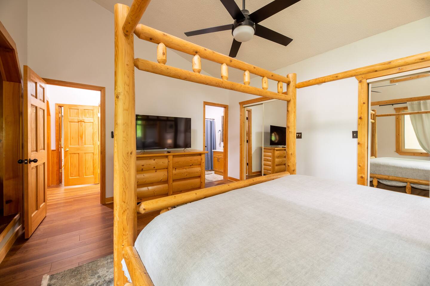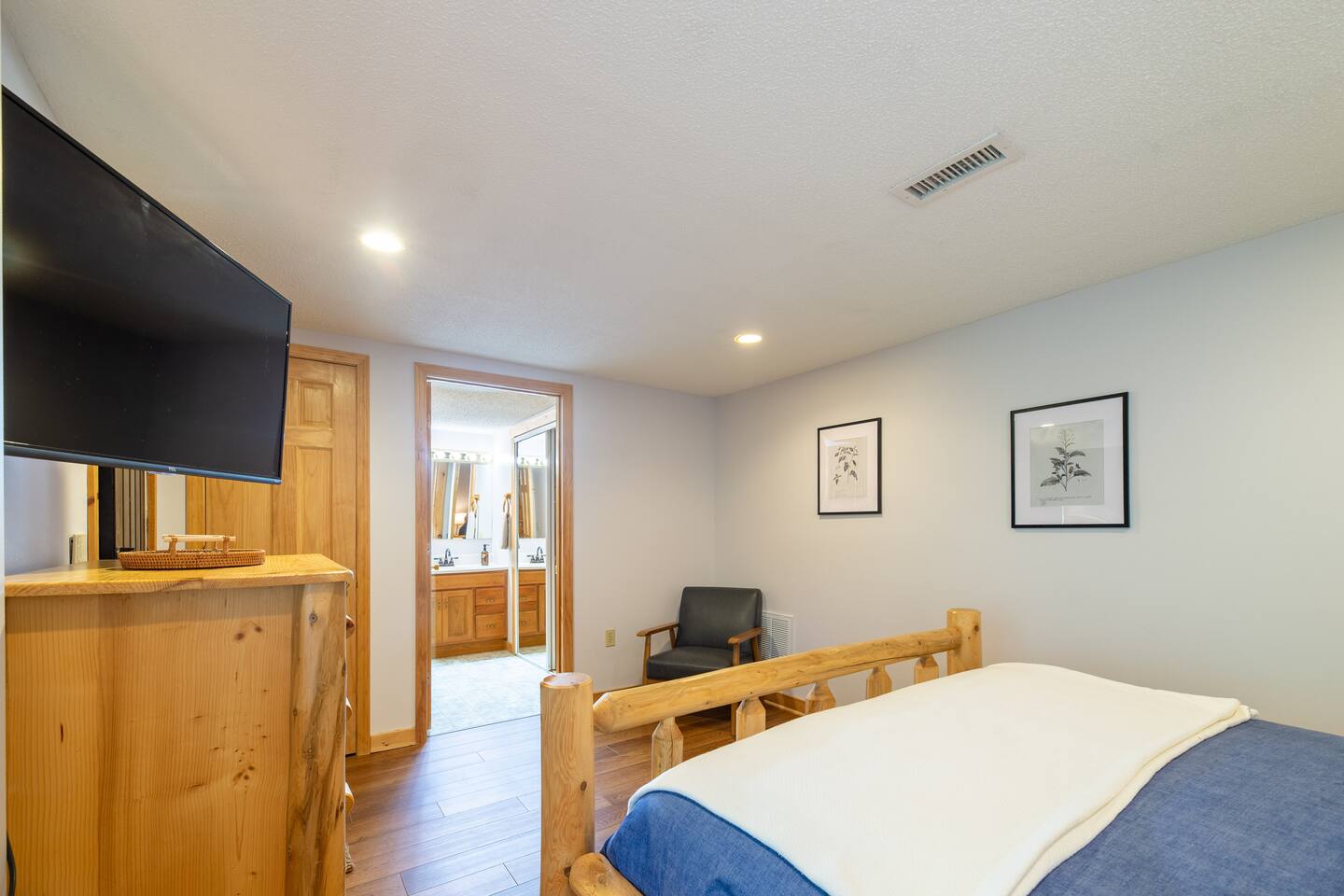 The kitchen and living area are on the main (middle) level of the cabin. Upstairs, you'll find the master bedroom with a king bed, jacuzzi, and private bath, as well as a second bedroom with a king bed and a shared bathroom, both accessible via internal stairs. The third bedroom, with a queen bed, private bath, and washer/dryer, is located on the lower level, which is detached and only accessible from outside. All entry doors share the same lock code. The separate downstairs suite offers added privacy but may not be ideal for all families. Outside, the cabin features a bi-level deck with outdoor dining, ample seating, a hot tub, a fire pit with chairs, and a charcoal grill for guest enjoyment. Photo captions provide additional details about the property.